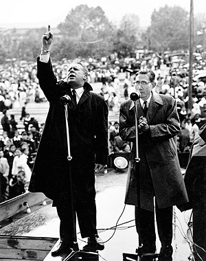 1957년 열정적으로 설교하는 밥 피어스 목사(왼쪽)와 통역하는 한경직 목사(오른쪽)의 모습. ⓒ월드비전 제공