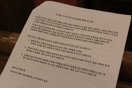 1. 북한 정부는 고통과 어려움을 겪고 있는 북한 사람들을 인도적차원에서 지원한 임현수 목사를 속히 석방하여 가족과 교회로 돌려보내 주시기 바랍니다.